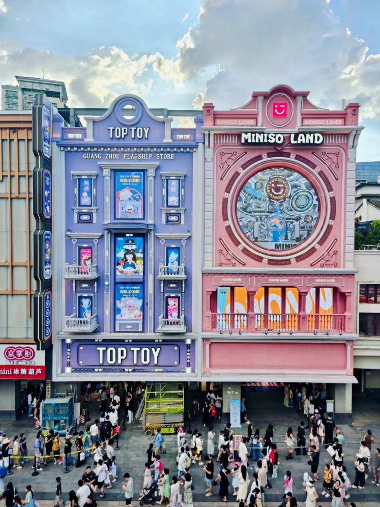 且纵观潮玩品牌圈,在核心商圈开出规模化旗舰店的并非TOP TOY一家。尤其是在上海、广州、成都这种年轻潮流化城市,越来越多的大型旗舰店落地,不仅有来自泡泡玛特这种强大对手,还有母公司名创优品的直接竞争。