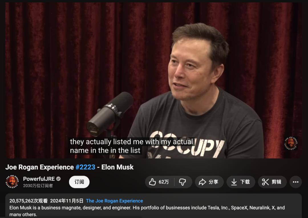 以海外头部视频播客《The Joe Rogan Experience》为例,其播客内容不限于文化、时政、商业等多个赛道,每一期观看量基本保持在100w上下,邀请过马斯克、特朗普等世界级影响力的嘉宾,成为现象级访谈IP。