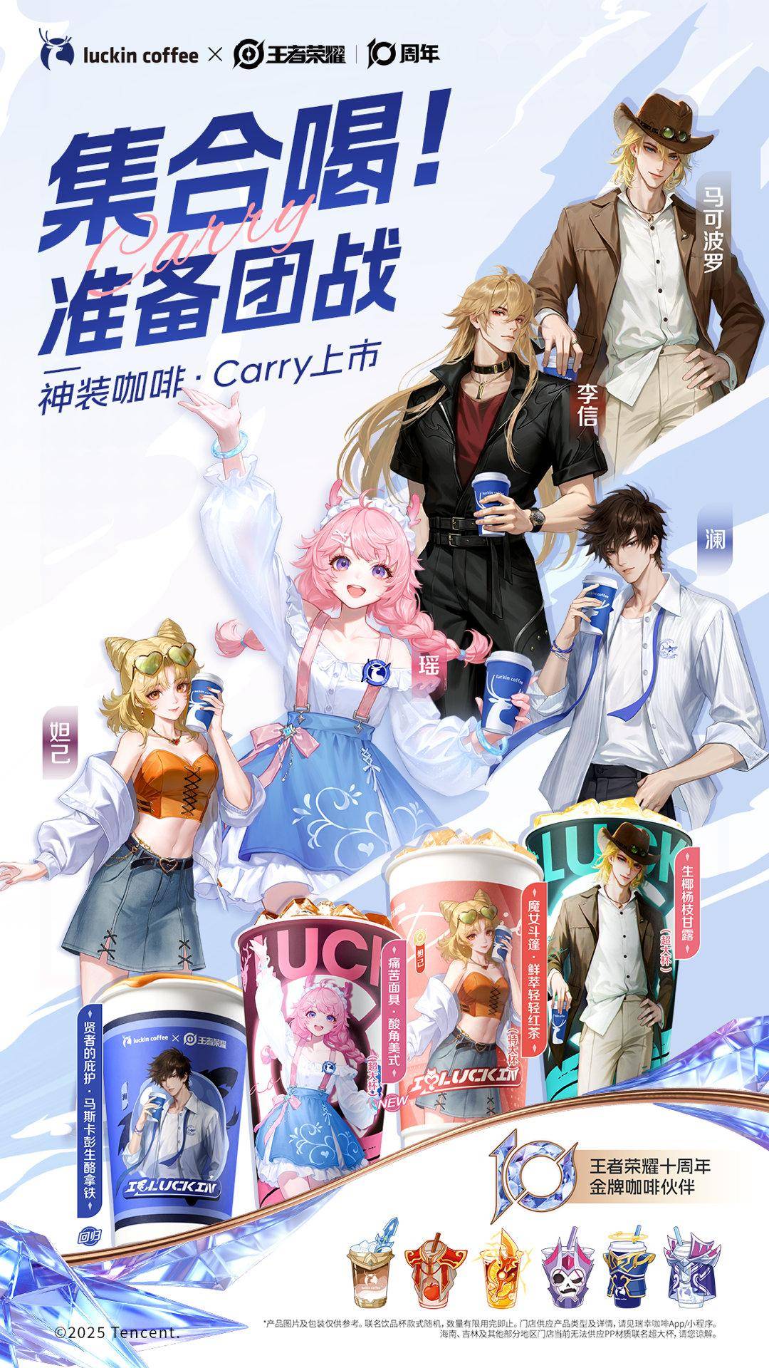 两周之前,《王者荣耀》与瑞幸咖啡进行了联名合作,推出了新口味——痛苦面具·酸角美式。除了惯常的纸袋和杯套,《王者荣耀》还为粉丝准备了烫金徽章、NFC王者启动卡和联名保温杯等数款衍生品。