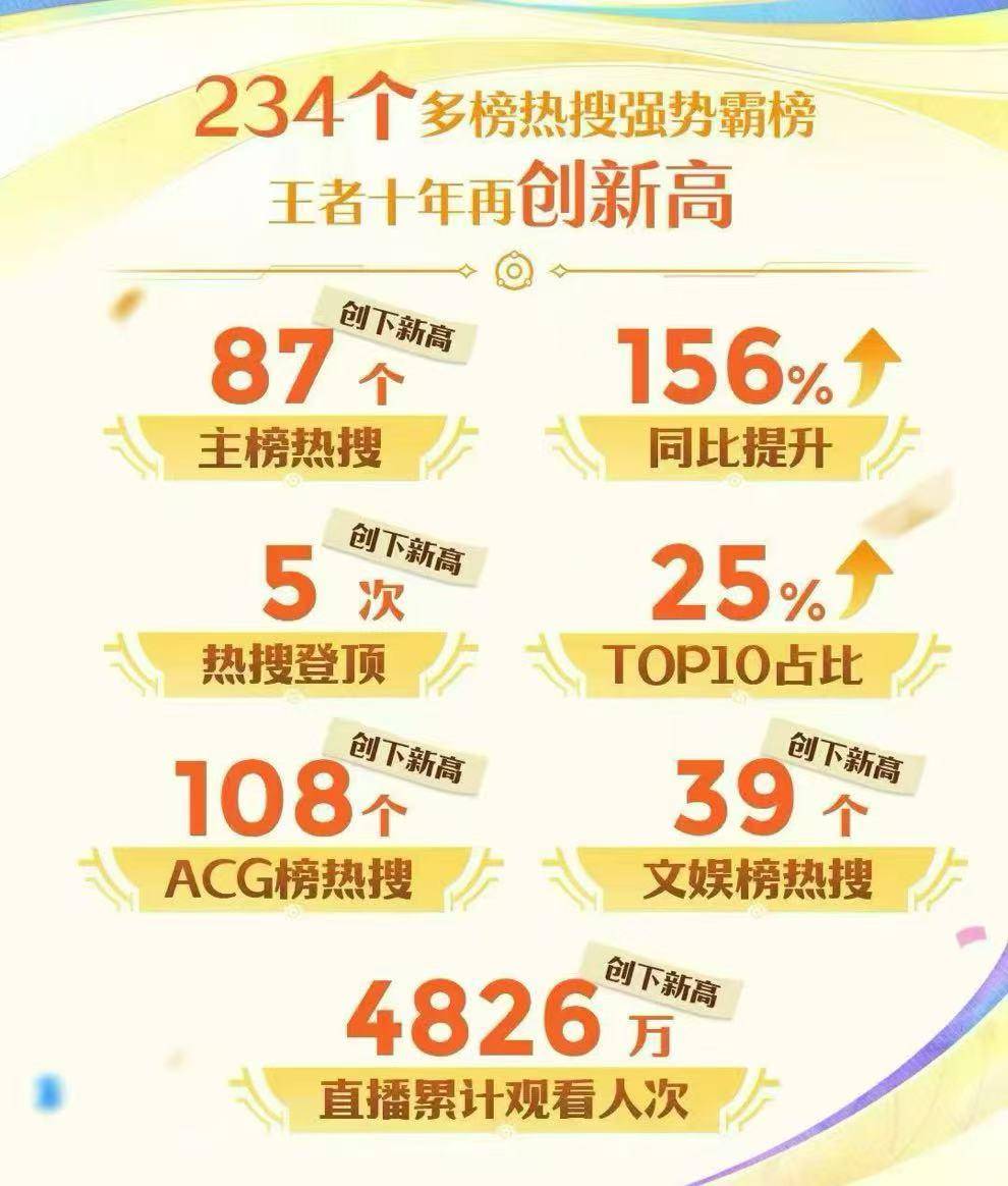 据不完全统计,王者周年庆及共创之夜在各个社交平台累计热搜话题数已经超过681个,目前仍不断有新的热点话题出现。