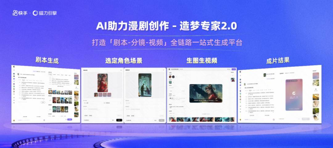 首先在生产端,近期,快手上线了漫剧生产的AI系统——造梦专家2.0,可以提供剧本、分镜、视频全链路一键生成服务,极大降低了漫剧的生产成本,进一步缩短制作周期。这一工具也向快手站内的漫剧分账团队免费开放。