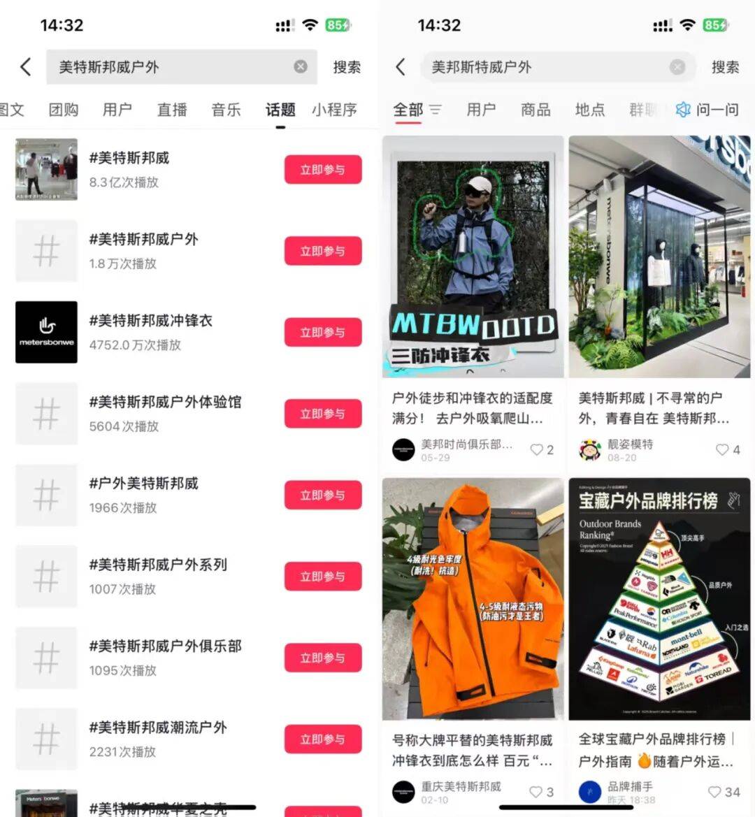 目前,“【华夏之壳-林系列】户外三防冲锋衣”已经迭代到 2025 春款,单款配色包括“黛土灰”“竹影绿”“玄影黑”。如果从小红书、抖音等社交媒体上搜索美特斯邦威,可以发现它的话题流量还算可以,品牌曝光度不错。