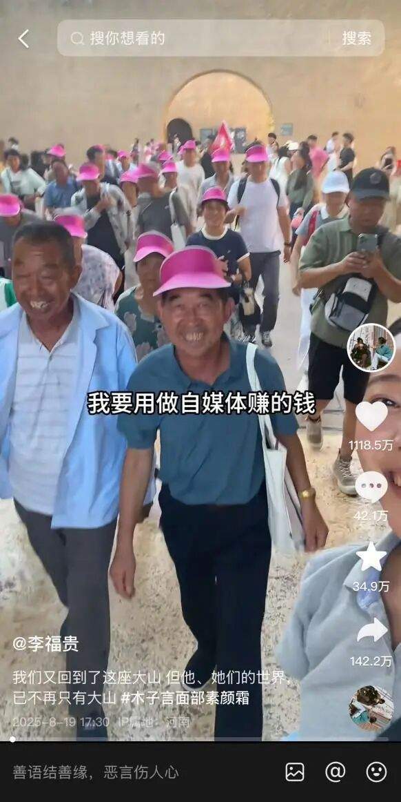 另一个值得注意的点是,李福贵的视频出镜的大多数是老年人,农村留守老人是这几年大众比较关注的社会议题,这也让李福贵的视频锁定了很多目光。8月李福贵发布的带着40多名村民去旅游的视频,也让更多人看到了乡村留守老人的真实处境,很多人都没出过远门,甚至连村子附近的县城都很少去过。