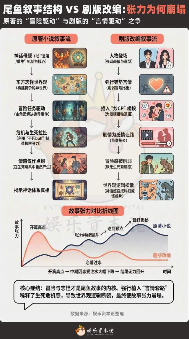 因为复活的设定,让尾鱼女主天然免疫死亡,而“不会死”意味着冒险中的危机、死亡带来的情感拉扯、角色生死之间的黏度,全都会大幅下降。阿水总结得很清楚,“男女主在冒险中产生情感,本来是依靠生死时刻去建立的。但尾鱼女主不会死,那你要怎么写那种惊险?怎么写情感的紧绷?一下子就没张力了。”这就是尾鱼剧增加感情线的天然矛盾。