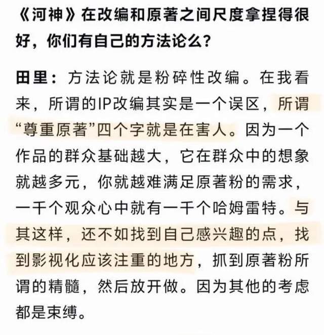 与此同时,尾鱼小说的书粉也没闲着,飞速翻出《枭起青壤》导演田里在八年前拍《河神》时的一段采访,文字中“尊重原著是在害人”如同一颗延时炸弹,刚好在剧版遭遇质疑的当口“砰”地炸开。书粉怒火高涨,网友判断混乱,评论区从“你没懂原著”吵到“你就是不尊重原著”,再吵到“你拍的根本不是原著”。