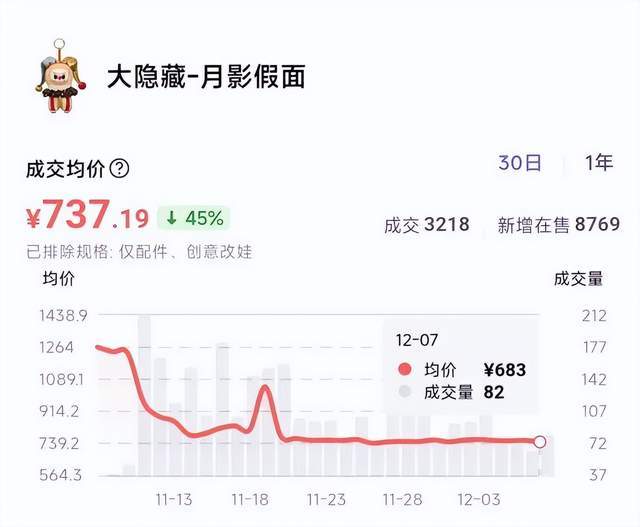 大热新品WHY SO SERIOUS系列搪胶毛绒的大隐藏——Labubu“月影假面”在二手平台曾被炒至最高1200多元,不到一个月时间,价格已回落至683元。
