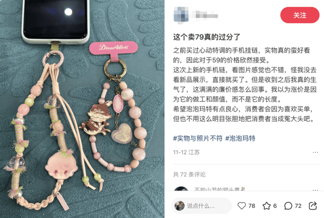 “之前买过Dimmo心动特调的手机挂链,实物真的蛮好看,59元也能接受。新品不仅涨价了,而且满满廉价感。”一位购买了Dimmo手机挂链的消费者吐槽道。另一位消费者也表示,“之前买Dimoo手机链就是因为实用,49-59元的定价也相对划算,怎么现在都跟普通盲盒一个价了?