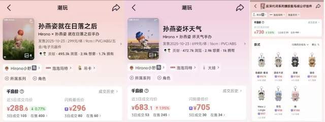 另外,泡泡玛特与歌手周深联名的“反深代词”系列搪胶毛绒再次上演了“一盒难求”的火爆局面,同样IP小野Hirono 与歌手孙燕姿联名的“日落以后”、“坏天气”系列手办,同样在二手市场被炒到高价。
