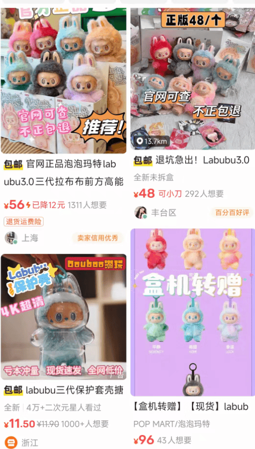 新一代Labubu4.0(心底密码)系列则发售即巅峰,因大规模品控问题引发争议,普通款在二手市场多数处于60-90元的价格区间,跌破发行价。即便是隐藏款,市价最高也仅有264元。
