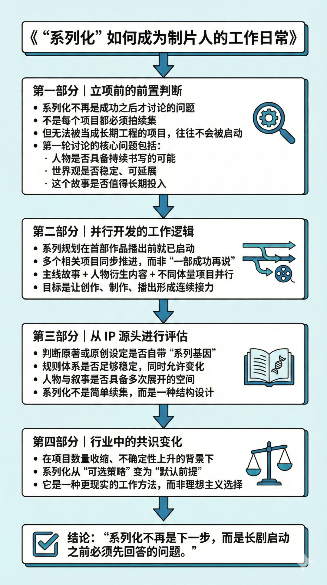 在项目数量收缩、不确定性上升的行业环境中,这种工作方式并不是出于理想主义,而是极为现实的选择。与其把全部筹码押在一次性成功上,不如提前判断哪些内容值得被长期对待。系列化正是在这样的判断中,被越来越多制片人纳入日常工作逻辑,成为长剧项目启动之前,必须先回答的问题之一。