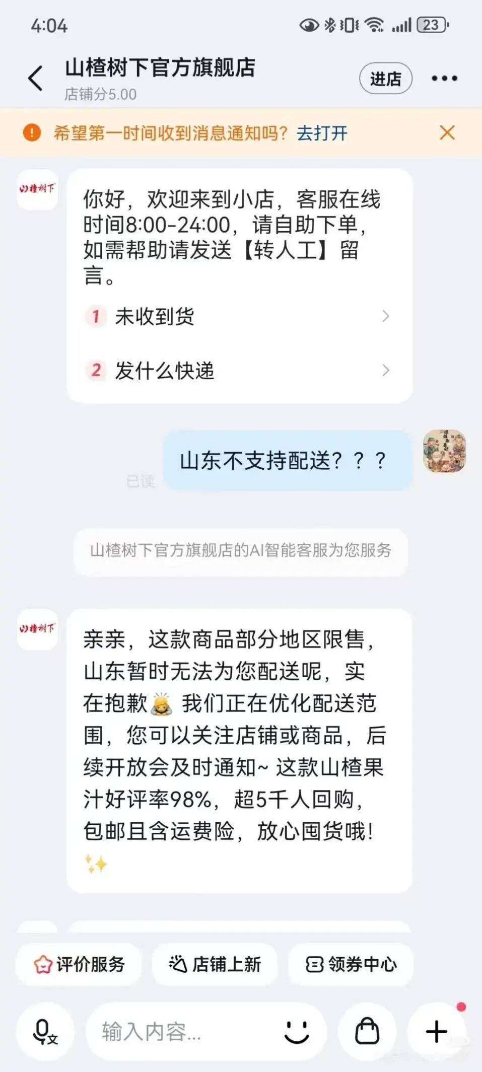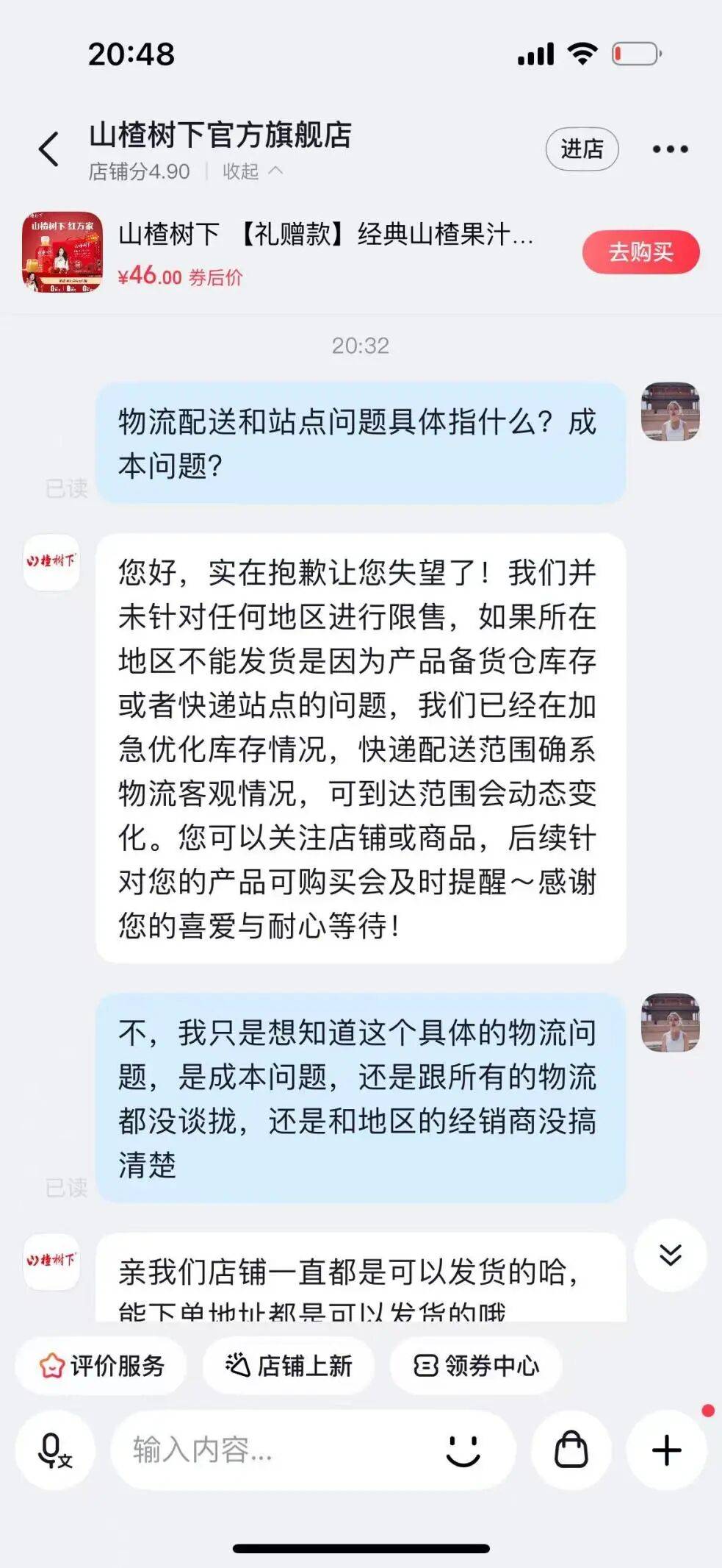客服或许没有权限透露敏感的供应链条细节,但对消费者而言,这样的处理方式很难接受:即使客服所说为真,所有山东网友也值得一个公开正式的解释,而不是私信追问才能要来的交代。