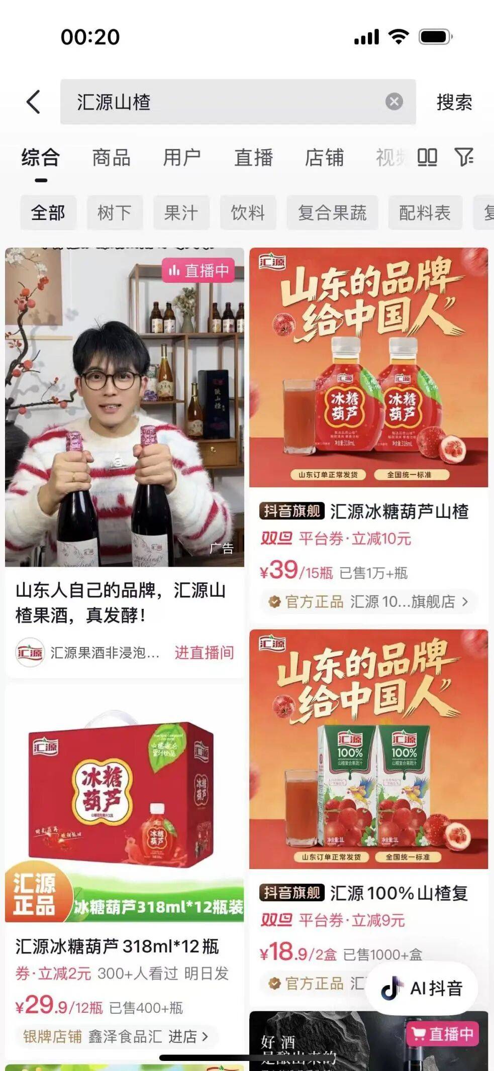 汇源果汁在抖音、拼多多等电商平台的宣传页上直接用大字标出“山东的品牌给山东人”,直播标题里也强调了“山东人自己的品牌”。