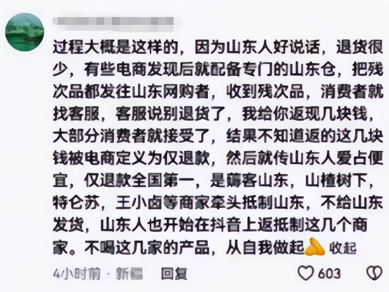 随后又有人传言,少数山东地区消费者滥用“仅退款”条款,一些商家会对山东区域进行拉黑。同时也出现了方向相反的传言:山东地区消费者好说话不退款,因此部分商家建立“AB仓”将次品发往山东。