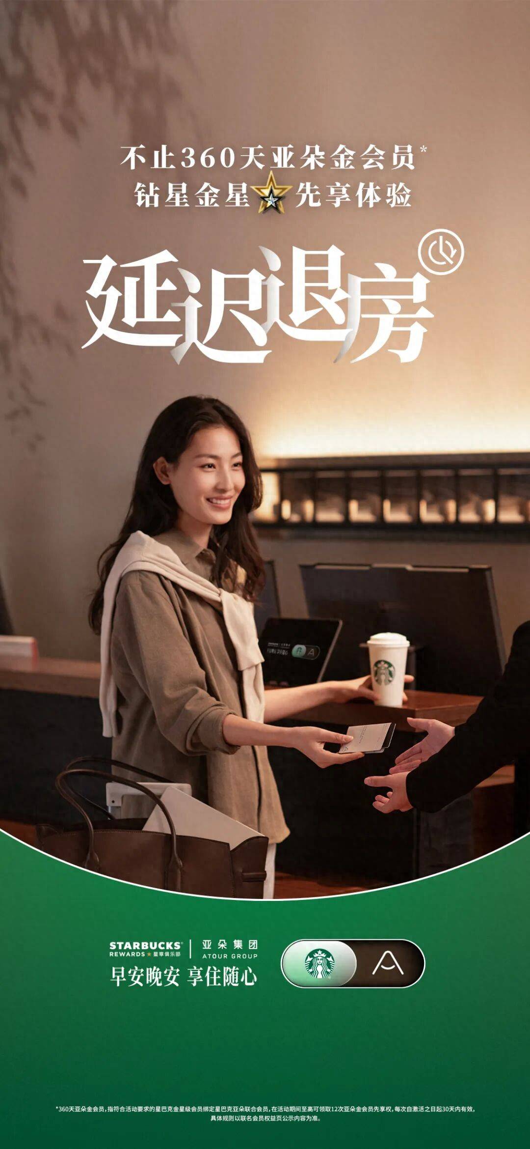 加入联合会员的星巴克星享俱乐部金星、钻星会员,可体验一年至高360天亚朵金会员核心权益,享受“升级好房、双人早餐、延迟退房”等实用出行福利。加入联合会员的星享俱乐部会员,如在亚朵集团旗下指定酒店入住期间为亚朵黑金、铂金或金会员,在星巴克指定渠道消费还可享受双倍积星。