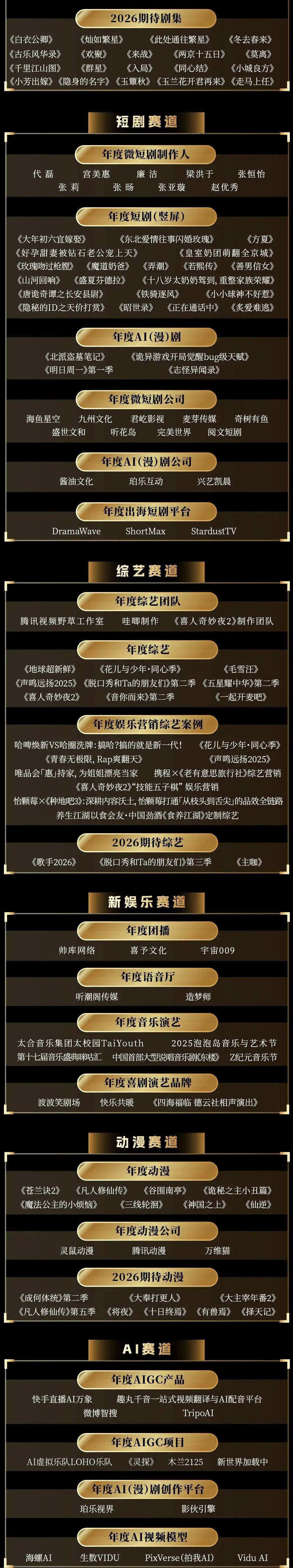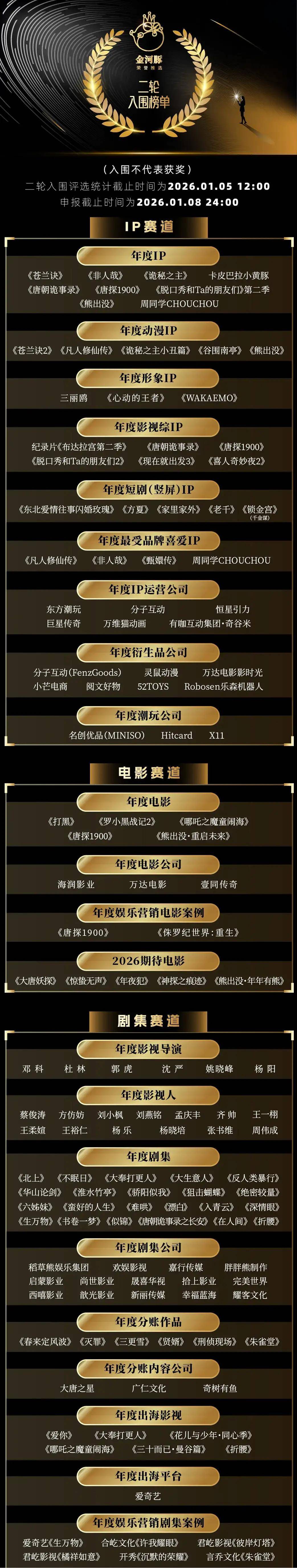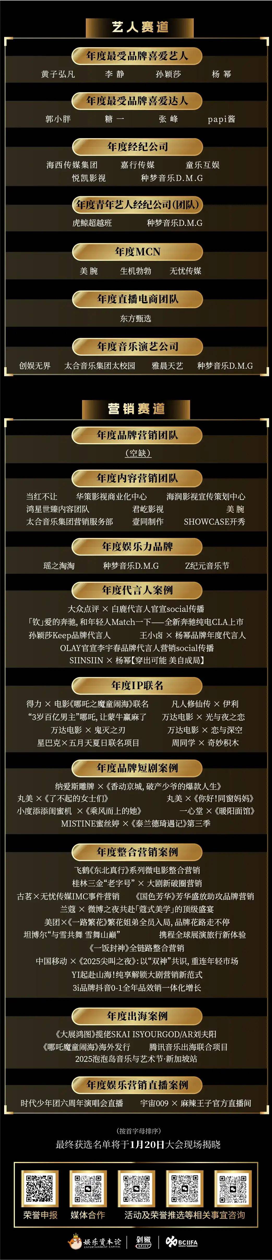 今年我们累计收到了近300个申报,涵盖了中国娱乐产业的10大赛道——IP、电影、剧集、短剧、综艺、新娱乐、动漫、AI、艺人、营销。