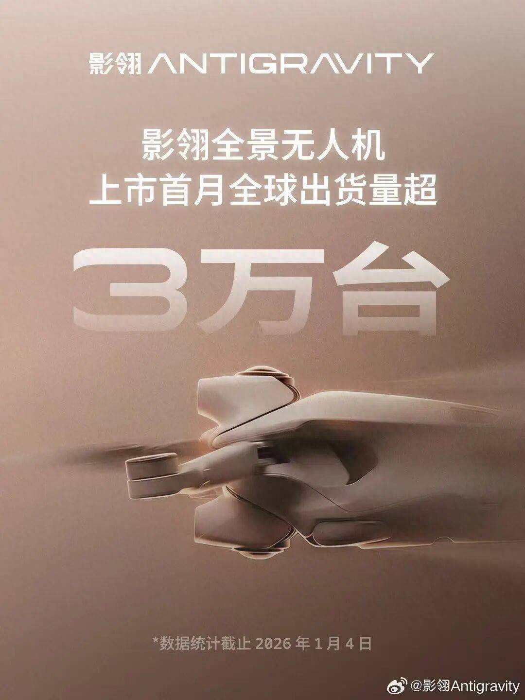 1月13日,影石旗下无人机品牌影翎发布了Antigravity A1上市1个月后的战报,全球出货量突破3万台。