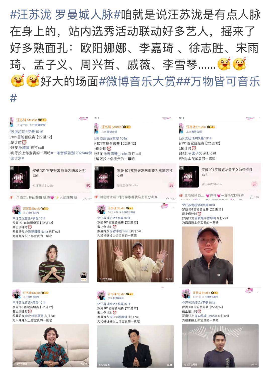 欧阳娜娜、李雪琴、徐志胜等艺人被“摇来”亲自下场,为自己支持的小怪物拉票,#汪苏泷罗曼城人脉# 直接冲上热搜。