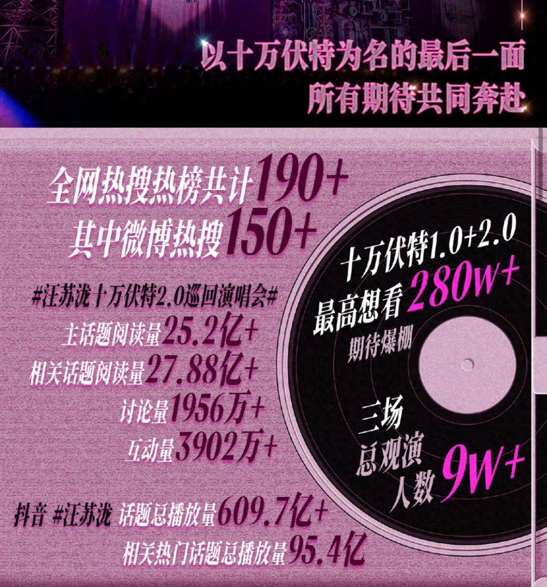 从2025年12月31日的跨年场开始,《十万伏特2.0》持续三天的“落幕”创造了内娱演唱会现象级的热度:3日总观演人数超9w人,拿下累计全网190+热搜热榜,其中主话题#汪苏泷十万伏特2.0巡回演唱会#阅读量超25亿,互动量近4000w。