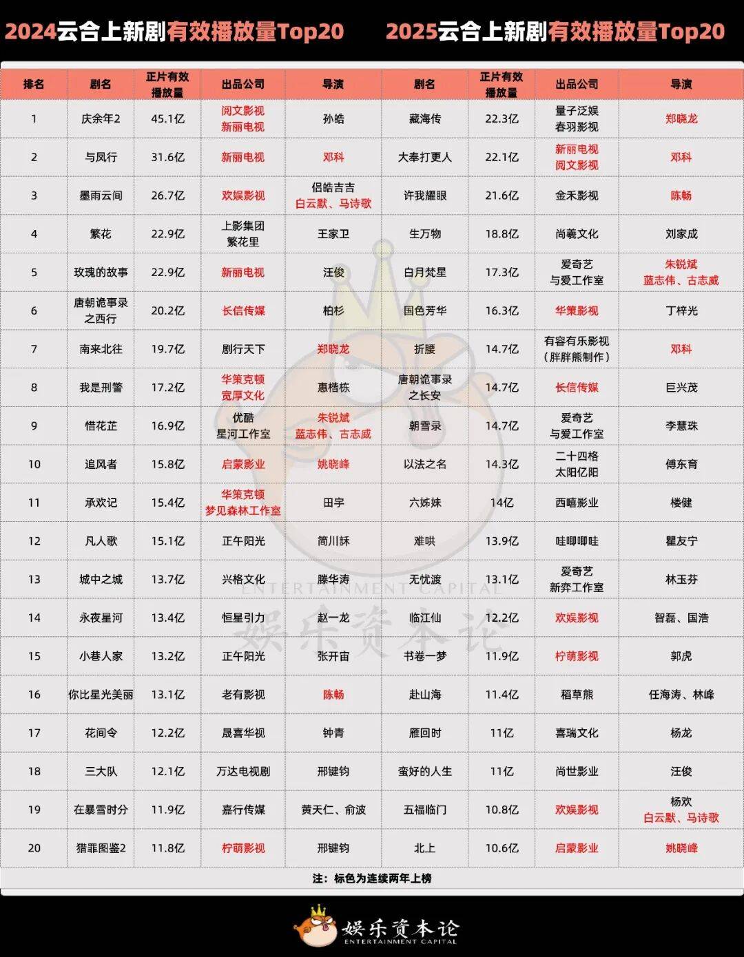 在行业整体产量下行、项目周期拉长的背景下,并不是每家公司都需要、也不可能年年高产。真正值得关注的,是哪些公司在不同阶段持续把好项目推到大众视野中。对比2024年与2025年的Top20名单,可以看到,新丽电视、华策集团、柠萌影视、欢娱影视、长信集团等公司依然保持着稳定的头部存在感。