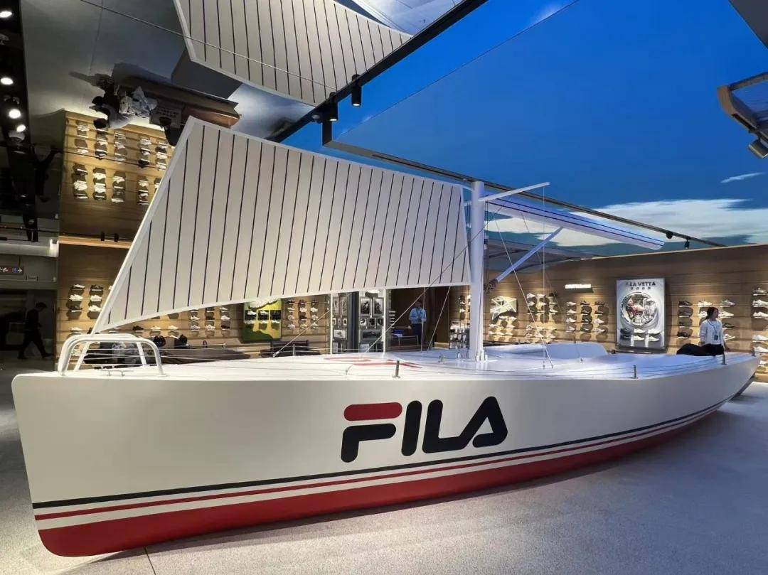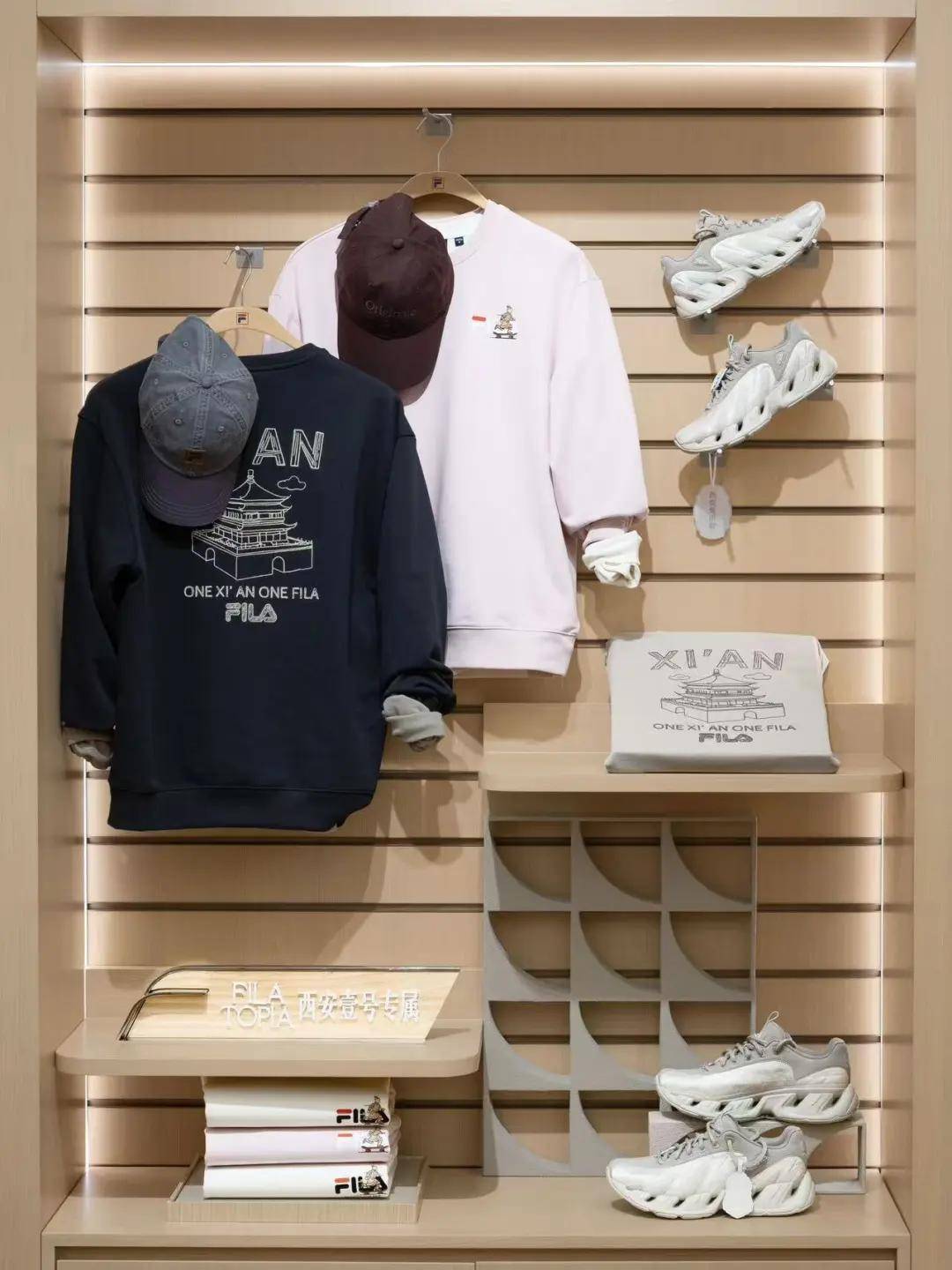 于是,围绕着西安这座城市和FILA TOPIA西安壹号店,FILA做出了罗马与长安的“双城序”文化表达。进门处的以古希腊《掷铁饼者》雕像为原型的艺术装置;门店中心摆放着一艘复刻“FILA TRI号”的帆船,用以回溯FILA品牌曾赞助航海家出海的壮举;墙面运用了大明宫的“抬梁式榫卯”结构......所有的文化符号都融入在门店之中。这家店内还有专为西安定制的产品,包括鞋和卫衣。