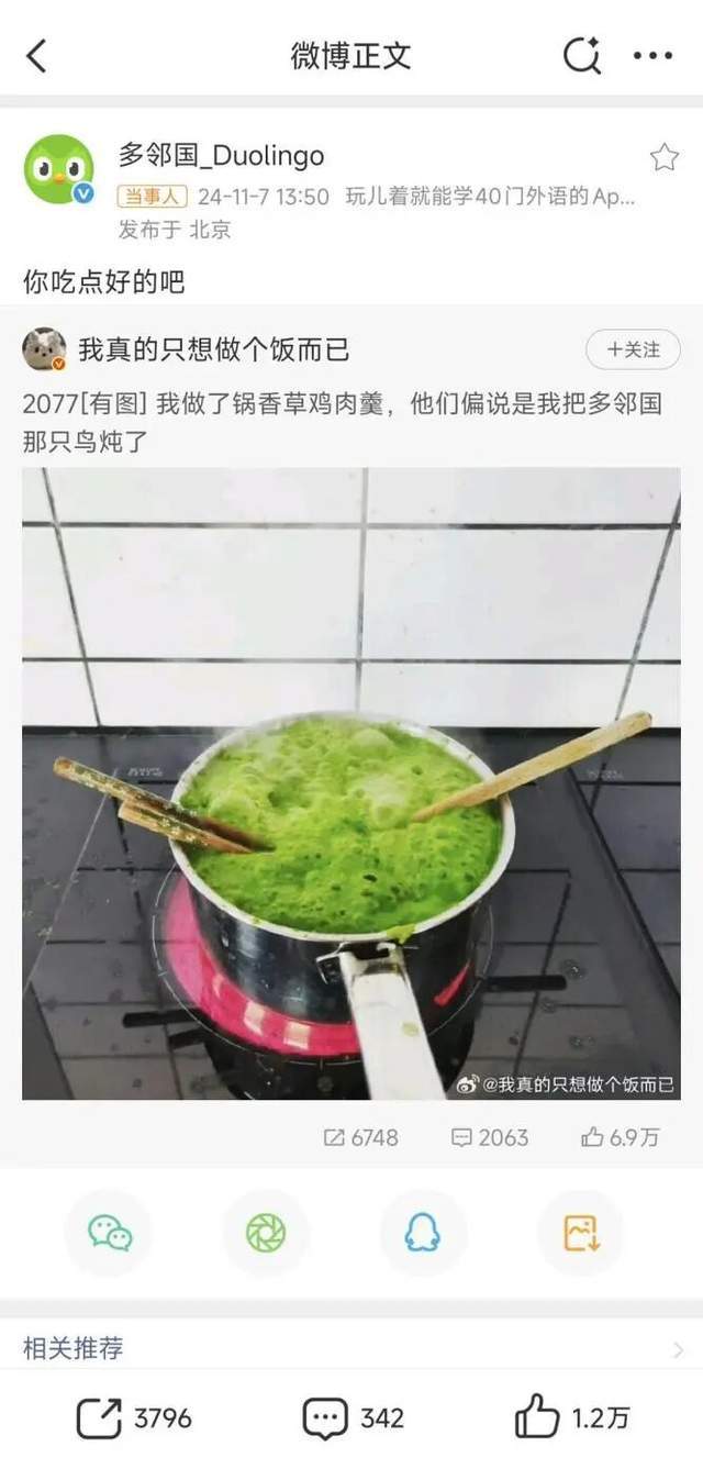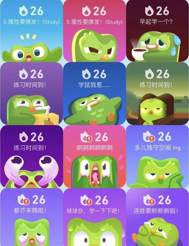 多邻国亦是如此。其“疯批催学”的人设走红,最早并非官方策划,而是用户受不了APP内无孔不入的催命弹窗,自发在社交媒体吐槽,制作成了各种各样的梗图。