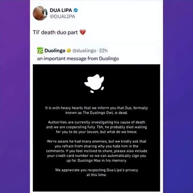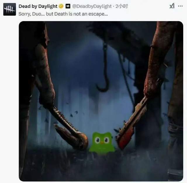 2025年2月,多邻国官推发帖表示多儿死了,紧随其后的是各种各样的游戏官方乃至明星发布联动梗图或者评论。这样的举动把不少休眠用户都“吓”了回来。然后在他们点开软件确认这只鸟是不是真的死了的时候,多邻国就宣布复活,并且说这是它给大家的考验。