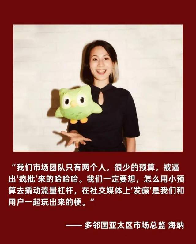 在一些大团队,一个热点海报可能需要层层审批,等发出来时热点早就过时了。而据此前品牌相关采访披露,多邻国的亚太区市场团队只有两个人,运营者拥有极大的内容裁量权。这种模式,让他们能像普通冲浪选手一样,秒回评论、光速造梗。