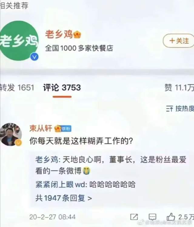 也比如说餐饮品牌老乡鸡,日常就是在微博发“咯咯哒”,偶尔和自己的董事长抖抖嘴皮子,成功打造起一个“不务正业的打工人”角色收获转发和流量,算得上是一次成功的抽象形象打造。不过,在形象利用上,还是远远不如靠大量玩偶打人海战术的蜜雪冰城高明,抽象的创新程度也远不如多邻国。