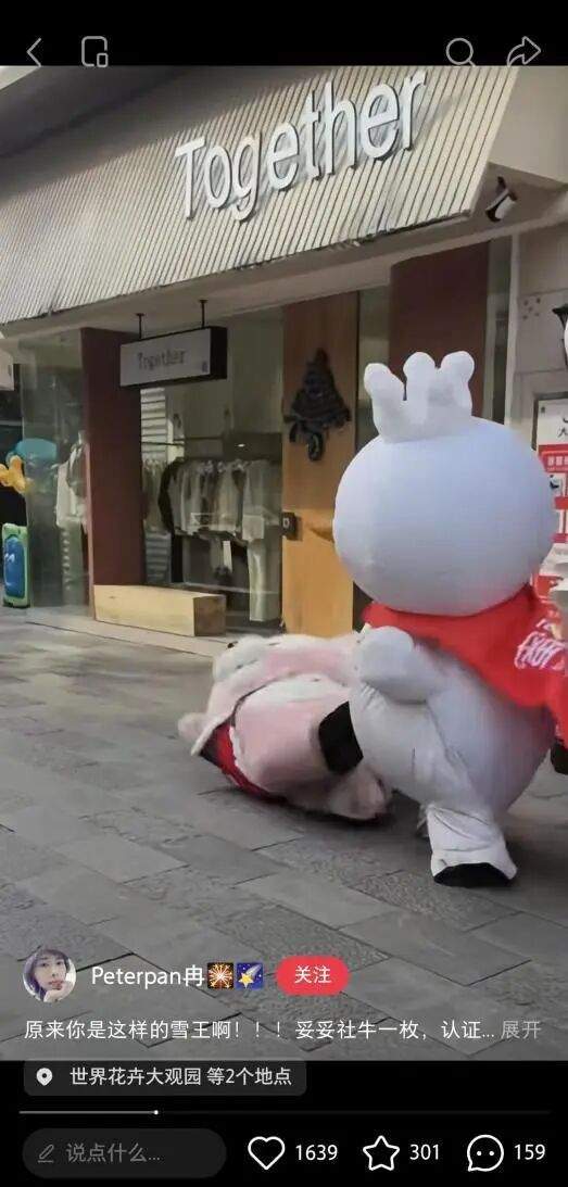 其一是通过极低成本的玩偶服进行大规模外形营销, 比如蜜雪冰城著名的“雪王街头斗殴”、“和其他品牌吉祥物商战”,以及多邻国大绿鸟和瑞幸联名结婚,这些原本笨重的玩偶服,因其行动不便产生的滑稽感,反而成为了天然的短视频素材库。