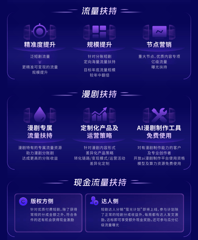 在制作层面,快手“漫剧专家”平台依托AIGC技术,覆盖创作全流程,让专业团队与新人皆能低成本高效创作,将漫剧创作从“技术活”转为“创意活”;政策与创投层面,快手更是为漫剧创作者提供了现金、流量扶持,单剧最高可获4%投流返点及2万现金激励;快手磁力引擎携手可灵AI推出“灵感·新纪元”AIGC创投计划2.0,更是实现了全链路助力商业化落地,联合出品模式单项目最高可获50万现金、千万灵感值及亿级流量扶持。