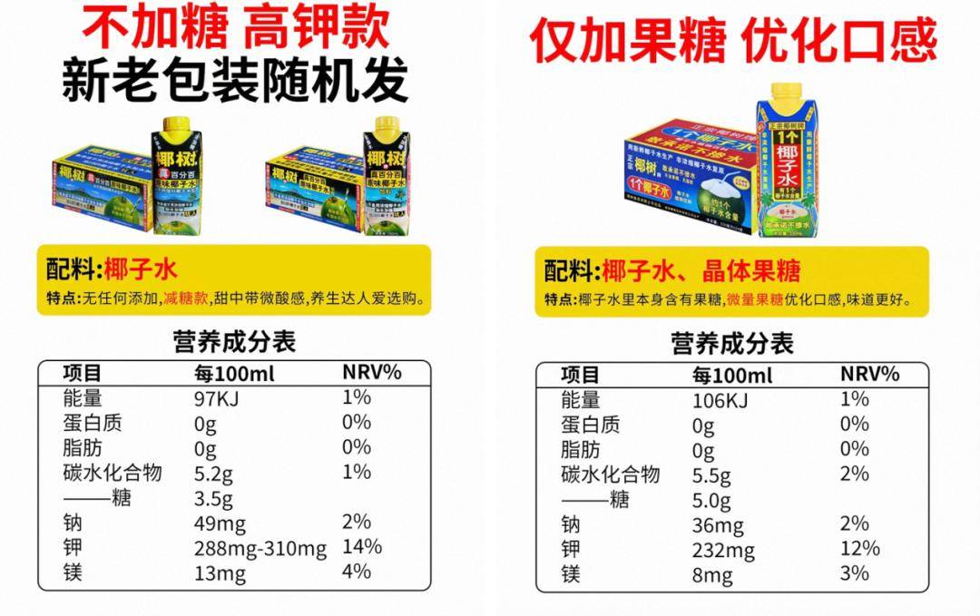 但吊诡的是,大众最爱喝的椰树产品始终是椰汁,其配料表清晰可见(水、鲜椰肉汁、白砂糖、酪朊酸钠、单,双甘油脂肪酸酯)。而对于椰子水用户而言,只对老椰水进行简单过滤加工的椰树椰子水,由于标注“含果糖”,被质疑不够健康。其对果糖进行分离的100%纯椰子水,又被不少消费者声讨“又酸又没味”“难喝”……