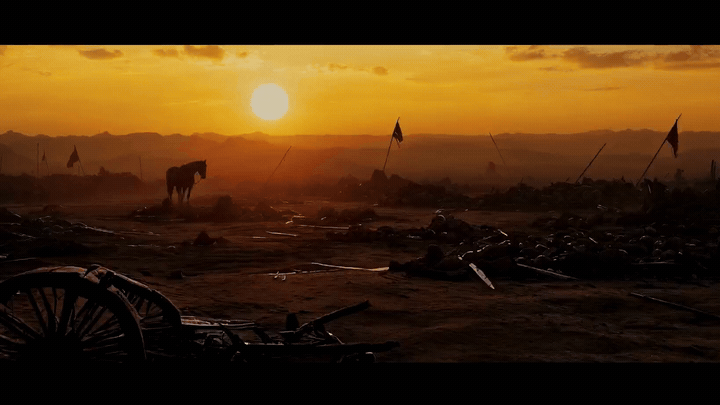 一个典型案例是:黄昏萧瑟的战场,残破的旗子,一匹孤马远远走过。这个镜头,在开拍前就用AI确定了。“如果没有AI,摄影指导需要一块开阔的场地、绝佳的黄昏光效;美术指导要布置大量废墟道具;执行制片得去找那样的战马。而AI用极低的成本,帮助我们锁定了调性和气氛。”