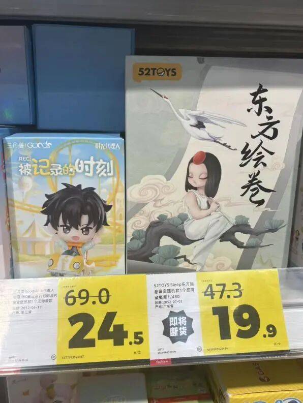 遇到部分门店清库存,还能折上折:在北京某好特卖门店,黑玩“mimi的citywalk”系列首发99元,标价从87.1元划线降到29.9元;52TOYS的“sleep东方绘卷”系列官价79元,在47.3元的渠道价之上再次降到19.9元。