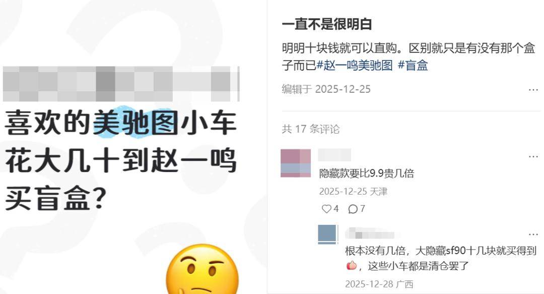 去年年底,赵一鸣引入了美驰图的1:64法拉利盲盒(内盒为与美驰图同属香港美昌集团,拥有法拉利车模授权的比美高),售价9.9元,当时便小火一把。