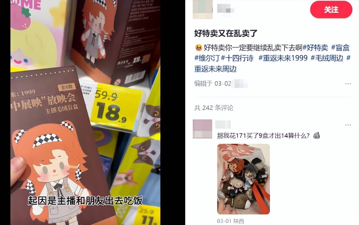 当赵一鸣联合代工厂和版权方,试图打造一个“9.9元抽万物”的潮玩宇宙时,另一边的折扣巨头好特卖,也开始在货架上“乱卖”:从泡泡玛特盲盒,到透卡、立牌这些“二次元年货”,这些谷子潮玩在过季之后流入不同门店,被打上直接半价甚至三折的标签,硬是催生出了一批“代购”。