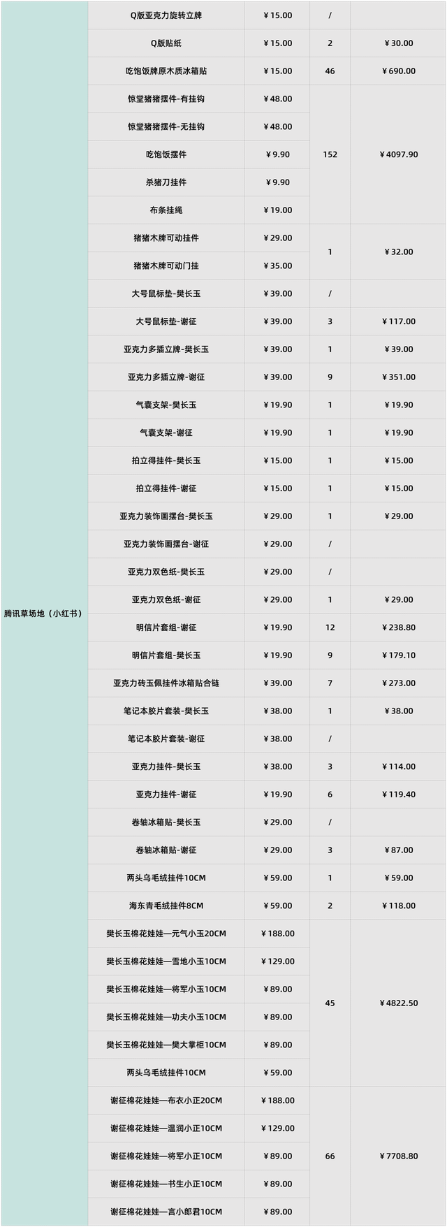 形象上,依然主要围绕樊长玉、谢征、猪猪、海东青这两大主角和两大萌宠;品类上,高销量产品主要有与RUA娃吧合作的棉花娃娃、与MOONRAY合作的惊堂猪摆件/挂件、影视卡牌三种。