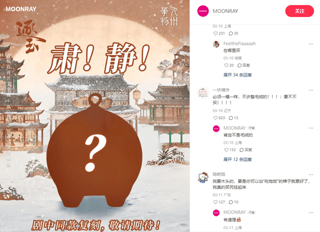 惊堂猪无疑是此次产品中的“黑马”,MOONRAY在剧情播到猪猪惊堂木出现时,及时在社交平台推出发售预告,并积极与提出意见的粉丝互动,保证还原道具原型,再由串联全剧的“杀猪女”内核联动网络玩梗,官方全渠道在播出期的单品销售额超过百万。