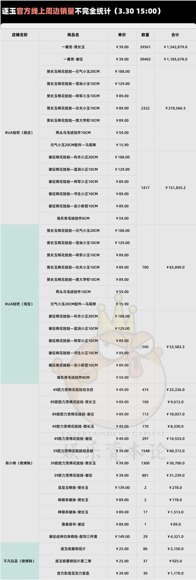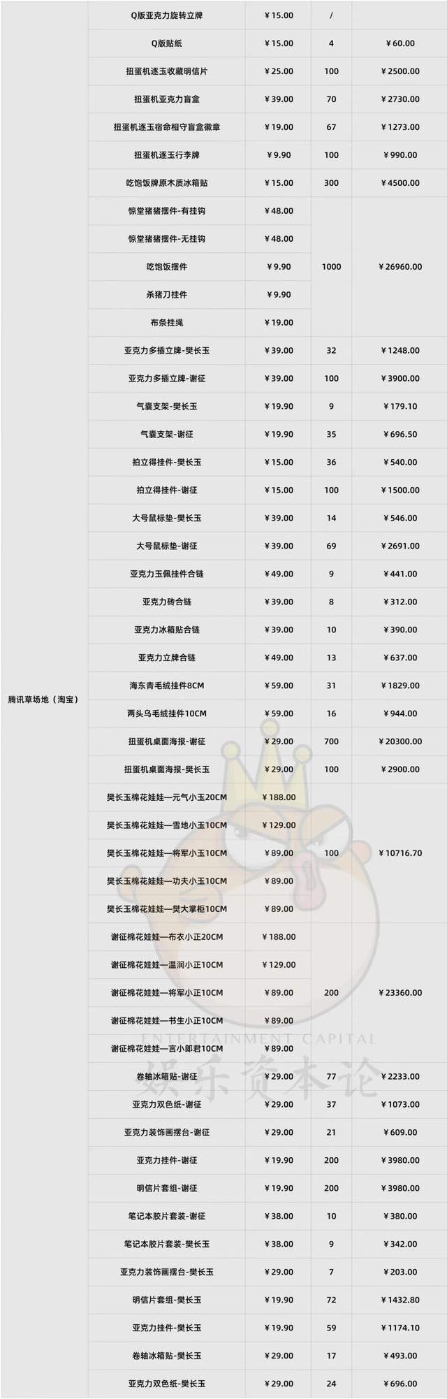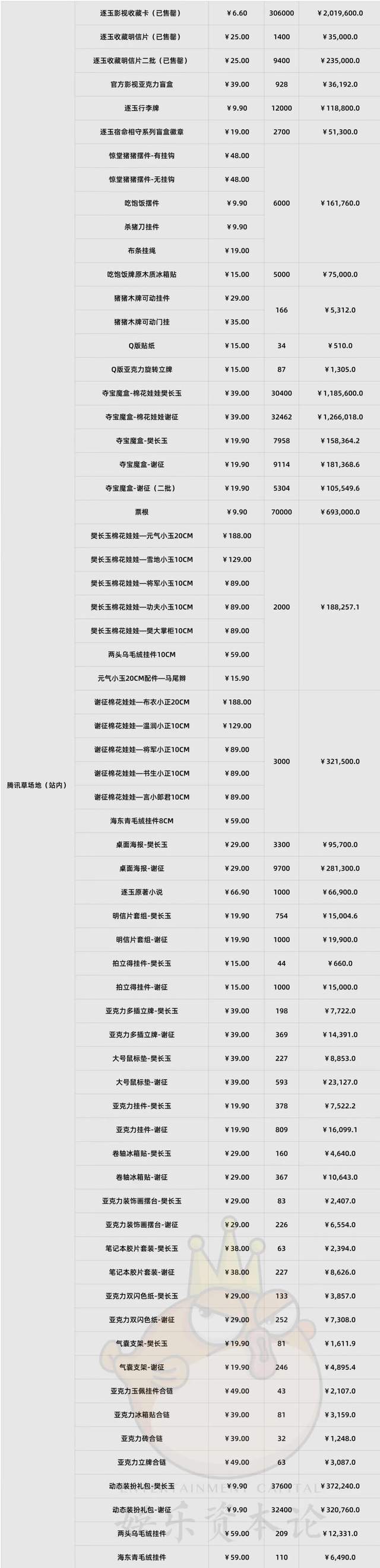销售额一向占衍生周边GMV大头的影视卡牌,这次除了爱奇艺发布了首日突破三项记录之外,线上卡机也仅七天就售罄。此剧虽然双平台播出,卡牌也由双平台发售,但从线上卡机标识来看,卡牌仍有爱奇艺自营,腾讯视频草场地为共同销售渠道。头部热播影视IP的卡牌发售量保底为5000箱,从官方198元/盒、每箱24盒的规格计算,保底出货量的总价是2376万,通常线上卡机会占总出货量的20%左右,如今已经全部售罄,那么影视卡牌现阶段的保守GMV不低于475.2万。