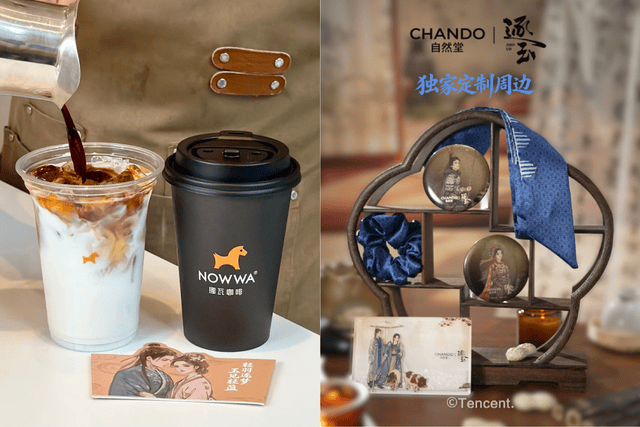 自然堂与挪瓦咖啡分别代表了两种不同的进入方式,前者通过发带、流沙麻将等具备审美与收藏属性的产品,将角色关系中的情绪沉淀转化为可被保存的物件;后者则通过联名杯套、明信片、定制卷轴等轻量载体,让“追剧”这件事进入日常消费的高频时刻。