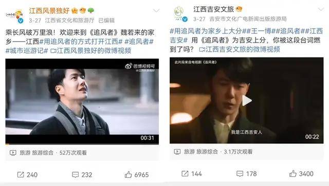 同时,大量地方政府也积极与IP合作,为家乡摇旗呐喊。江西吉安,作为著名的“红色根据地”,是《追风者》中推动剧情进展、引导男主步伐的重要地点。吉安政府也主动与剧方携手,联动剧宣进行内容传播。3月末,吉安文旅发博表示“《追风者》为家乡上大分”,4月,江西文旅官博喊话“魏若来常回家看看”,并发布多条相关内容。4月5日《追风者》主创直播见面会时,王一博、李沁、王阳、王学圻、兰西雅、宋帅也热情参与互动,为吉安“鼓与呼”,欢迎广大“追风人”前往吉安品美食,逛美景。