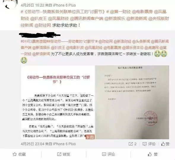 从4月14日开始,《叶问3》发行方大银幕团队宣布解散,宣传方火传媒遣散员工,两天前,快鹿旗下晟毅文化传媒公司的员工也向娱乐资本论官方微博发出讨薪求助。