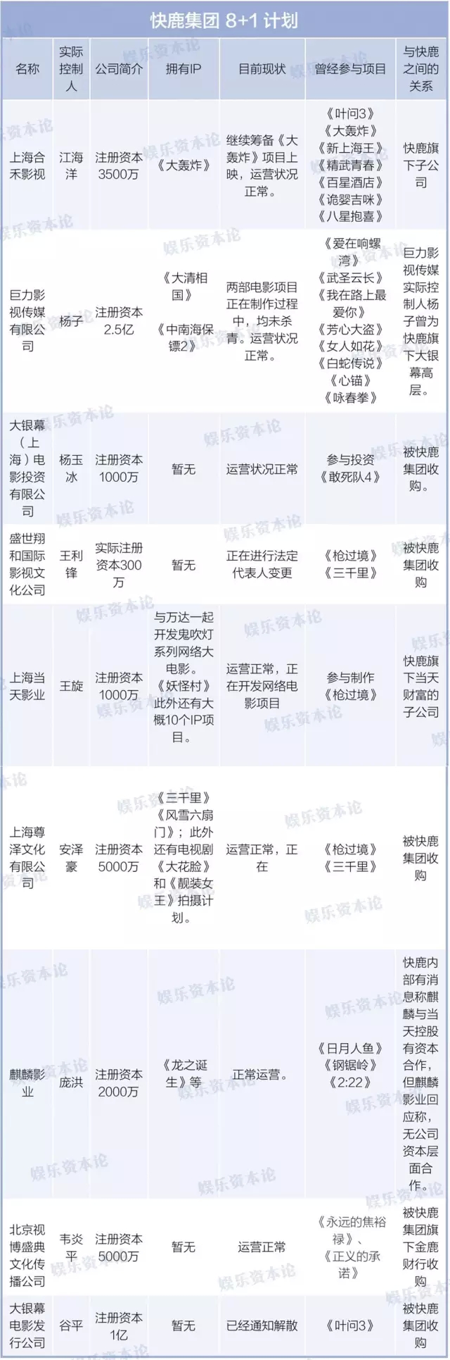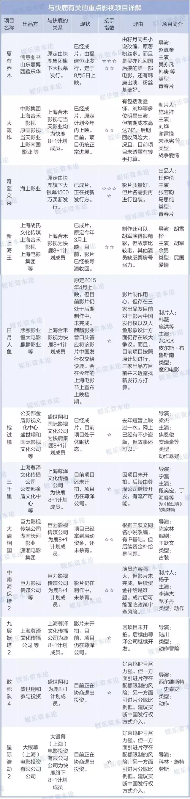 其中一家公司的负责人告诉娱乐资本论,上述20几个项目大部分原来就隶属于8家制作公司,快鹿集团是看中他们各自手中的电影项目,才在公司层面建立了合作,并将这些项目都纳入麾下。