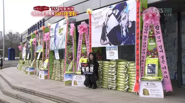 当然,live应援只是应援的第一阶段,因为粉丝们想要参与偶像的生活,想要照顾到偶像方方面面,应援的范围也越来越大,偶像参加电视剧拍摄、综艺节目录制等等,粉丝们都会提供食物应援,几百份的量想来也是件大工程。在韩国经常会出现这样的盛况,在某一挂着明星海报的活动场地周围堆满了大米袋,这叫做大米应援。