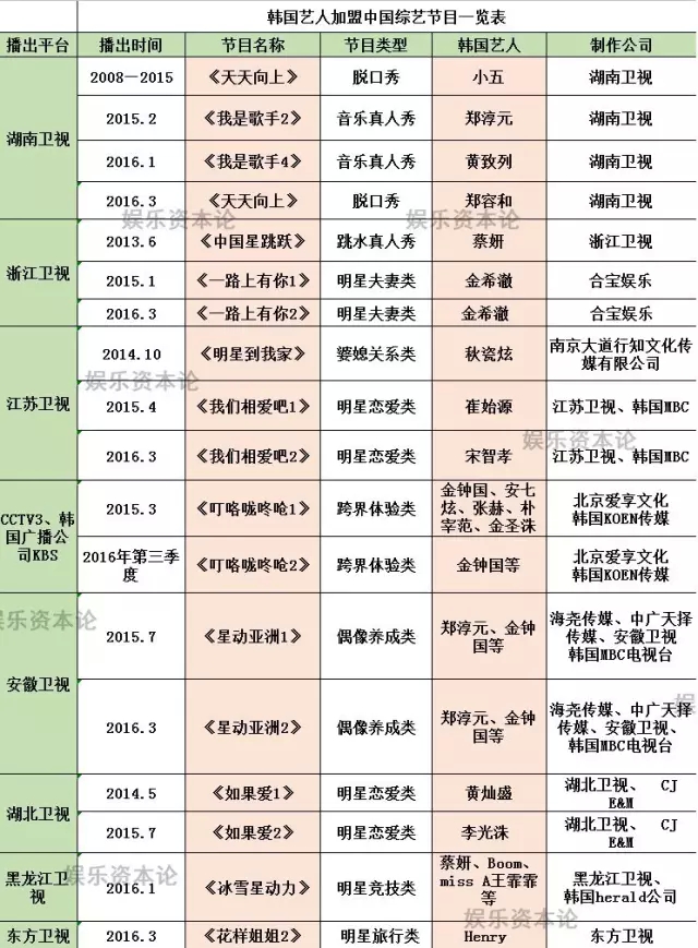 据不完全统计,最早来中国上综艺的韩国明星,其实都是在中国出道和发展的。如2008年加盟《天天向上》的小五,因为被天娱签下组男团才得到这样的机会;2013年参加浙江卫视《中国星跳跃》的蔡妍,早在2007年就签了中国娱乐公司,现在依旧活跃在中国市场。2014年10月加盟了江苏卫视《明星来我家》的秋瓷炫,签在了北京强视传媒,此前拍过《回家的诱惑》,这档综艺也让观众记住了她。