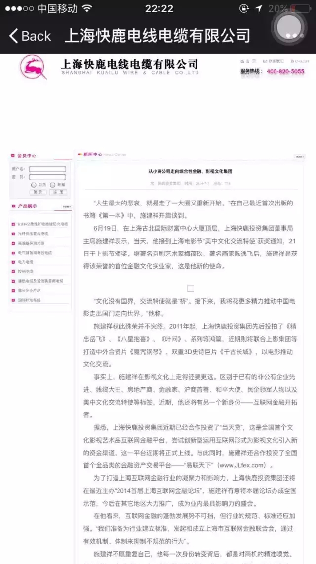 其实从2011年起,施建祥及旗下快鹿集团,就先后参投了《精忠岳飞》《忠烈杨家将》《八星抱喜》《叶问》系列等多部作品。更在2014年,推出互联网金融平台“当天贷”和金融资产交易平台“易联天下”等多个产品,专门投资影视文化产业。