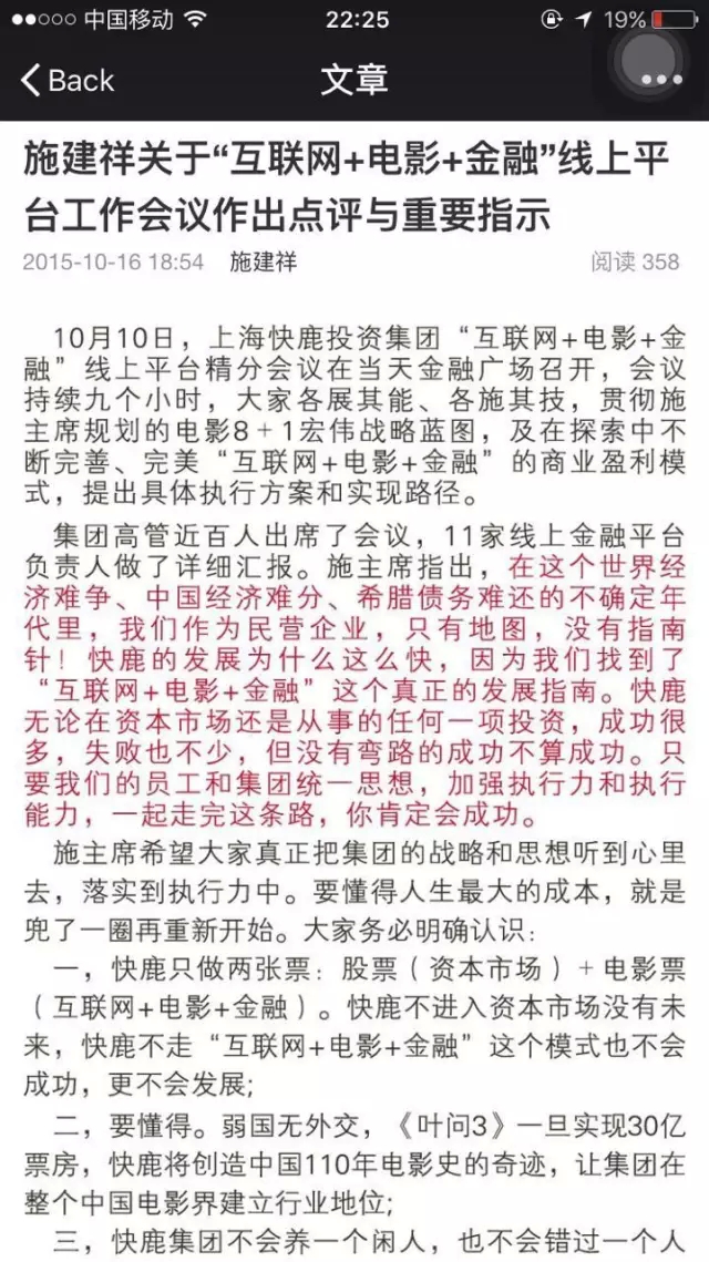 去年10月10日,快鹿集团召开了一场持续9个小时的会议,“互联网+电影+金融”这一商业模式成为最重要的议题。