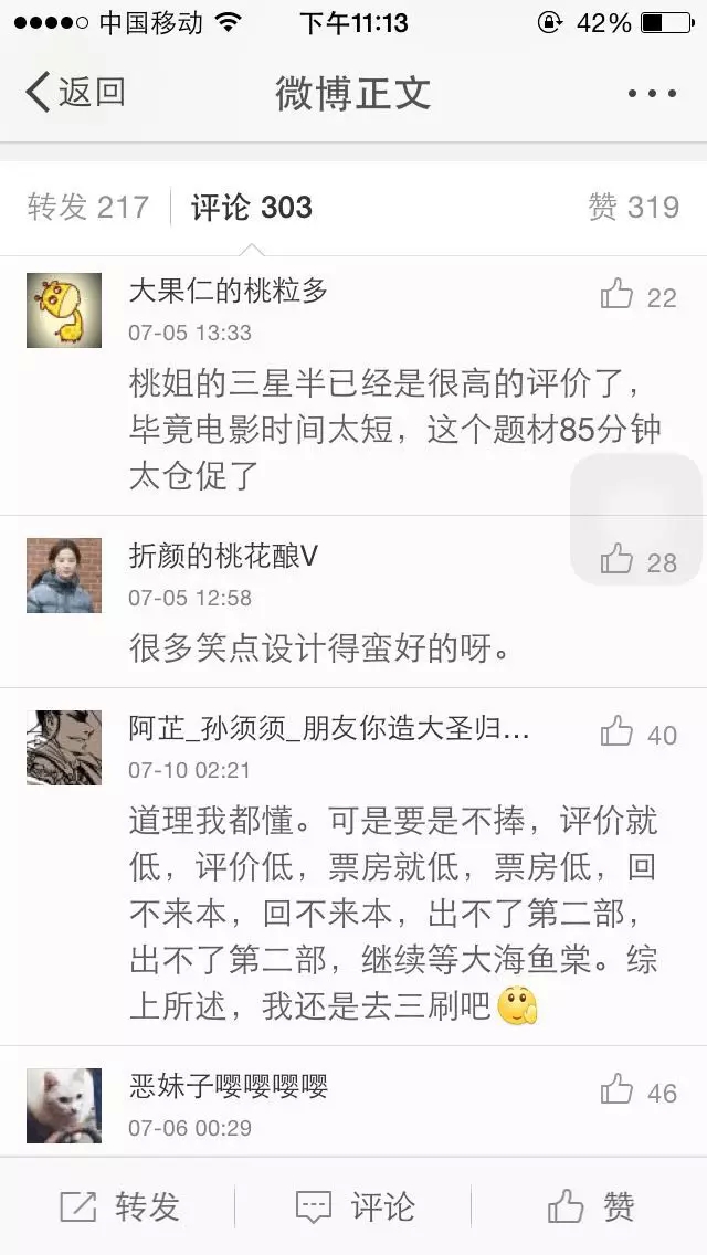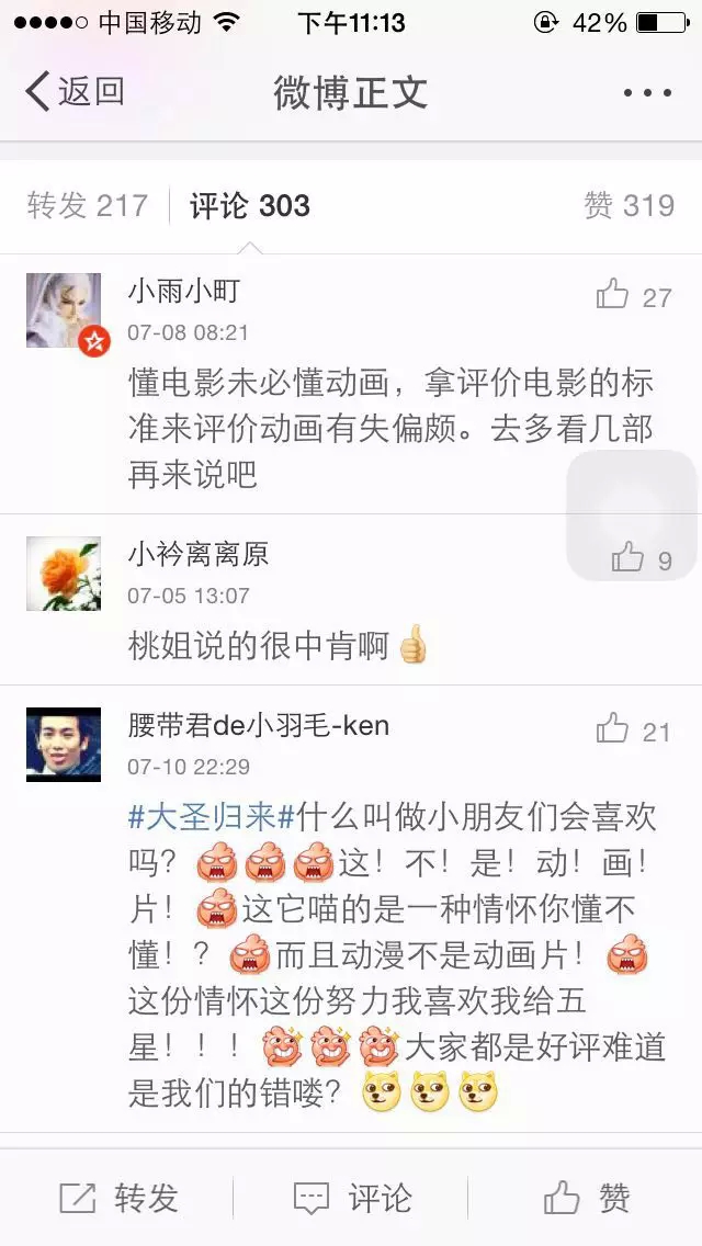 有趣的是,我们发现,《大圣归来》的所谓“口碑”宣传,似乎变成了国内电影人的一次“集体高潮事件”,有粉丝在微博里呐喊,给好评,“为的是一种情怀!”嗯,好吧……