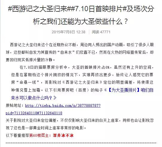 对国产动漫爱之深责之切的心态,已经成为我国动漫粉丝的一个常态。从《魁拔》开始,其实这种半营销半真心推荐的做法就已经存在。包括那部引起轰动但是一直没法面世的《大鱼海棠》,至今为人惦记。在宣传《大圣归来》的这一批人中,很大一部分就是这样一群粉丝。按照他们的思路来讲,“这样的国产动漫的良心作不支持,真的说不过去,必须二刷三刷”(二次三次买票看电影支持票房)。以至于在电影上映前,已经有粉丝在天涯、微博、豆瓣等各个渠道自发为大圣归来发声,甚至有粉丝开贴如何争取排片。