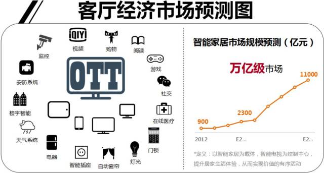 目前不完全统计,目前只能电视的累计保有量为8580万台,且每年以3000多万的速度在增长,未来85%以上的电视都将是智能电视。而市场对以OTT为核心的客厅经济的估值在万亿市场左右。