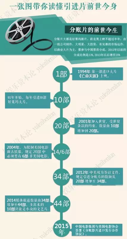 据外媒报道,2012年《中美电影协议》主要包括4方面内容。1、中国将在原来每年引进美国电影20部配额的基础上增加14部3D或IMAX电影大片配额;2、美方票房分账比例从原来的13%升至25%;3、增加中国民营企业发布进口片的机会;4、中美合拍片将享受中港合拍片同等待遇,在中国大陆放映不受引进片配额限制。